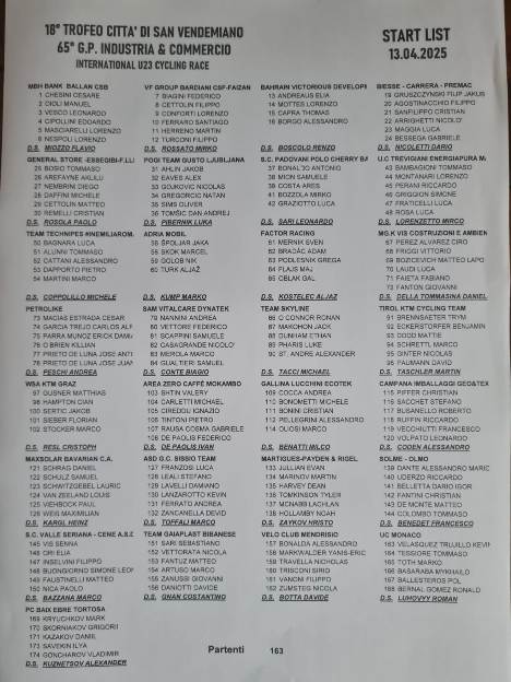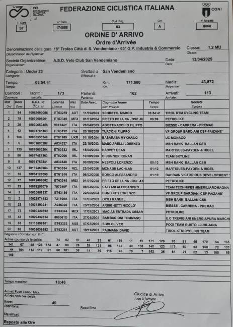 Ventidue anni ancora da compiere essendo nato il giorno 11 settembre 2003, Marco Schrettl , Campione Nazionale d’Austria categoria Under 23 in livrea Tirol Ktm Cycling Team vince in solitaria la 18° edizione del Trofeo Città di San Vendemiano valido anche per l’assegnazione del 65° Gran Premio Industria & Commercio precedendo al traguardo il messicano Sosè Prieto De Luna (Petrolike-Sidermec) di 9″ che ha battuto allo sprint un plotoncino di inseguitori comprendenti anche l’azzurro del ciclocross Filippo Agostinacchio (3°) della Biesse-Carrera-Premac e il varesino di Busto Arsizio Filippo Turconi, (4°) del VF Group Bardiani – CSF Faizanè) e all’8° posto l’abruzzese Lorenzo Masciarelli (MBH Bank-Ballan- CSB-Colpak) mentre a 13″ sopraggiunge Lorenzo Nespoli (MBH Bank-Ballan-Csb-Colpak) al 9° posto e, a completare la …quasi….top ten di giornata all’11° piazza Alessandro Borgo (Bahrain Victorious Development).