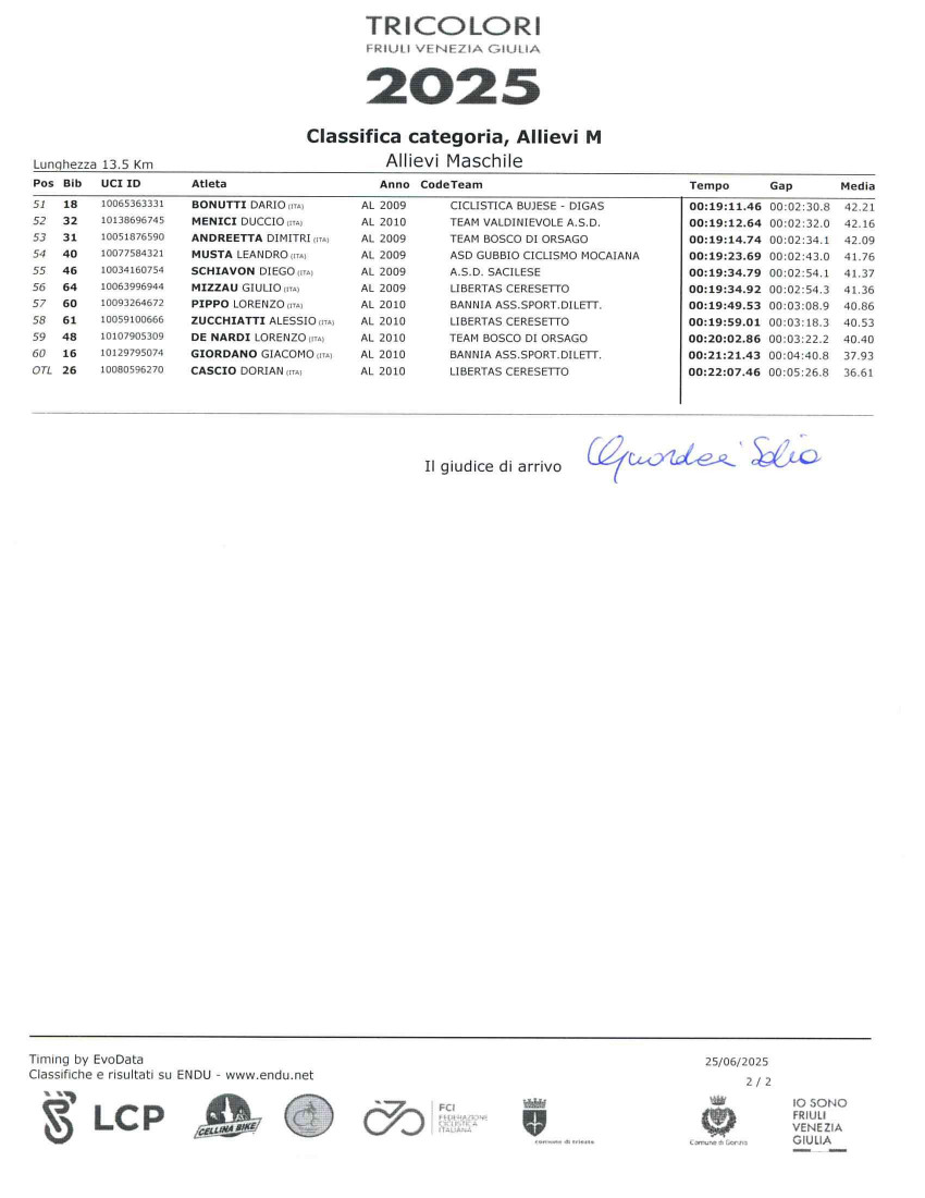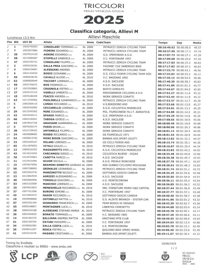 Cingolani si è imposto sul suo compagno di squadra Edoardo Fiorini e su Edoardo Agnini che ha completato il podio del Campionato che ha visto alla partenza 61 corridori dei quali in 60 hanno portato a termine la gara.