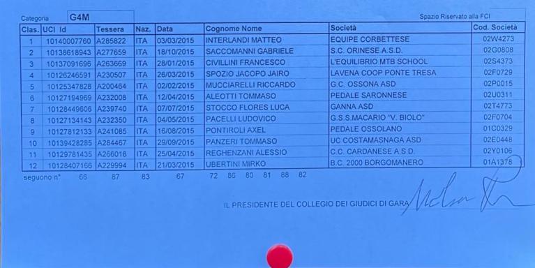 1)Manuel Pupillo (Polisportiva Besanese); 2)Nicolò Fraguglia (SC Orinese); 3)Gabriel Maggi (SC Busto Garolfo 1954); 4)Gianluca Polti (L’Equilibrio Mtb); 5)Federico Forlani (L’Equilibrio Mtb); 6)Edoardo Mori (GS San Macario-Valerio Biolo).