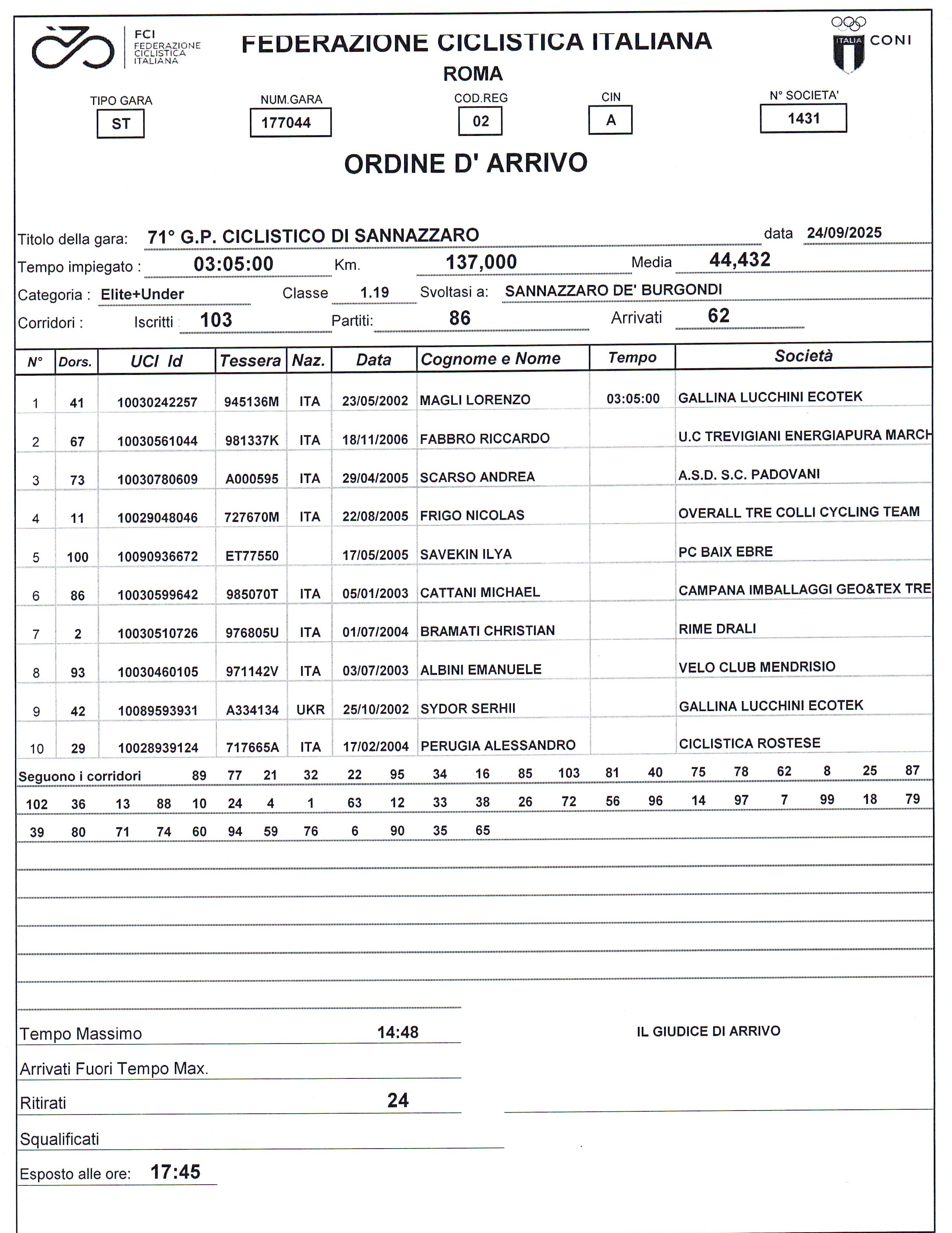 Ordine d’Arrivo 71° Gran Premio Ciclistico di Sannazzaro de Burgondi :