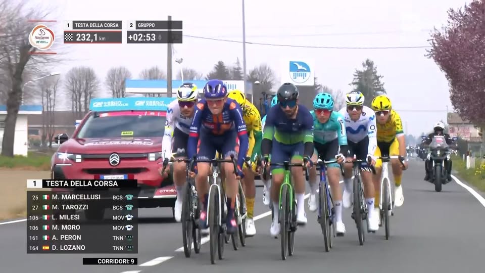 ore 12,15, siamo al km. 90 di corsa sempre 9 un fuga vantaggio 2’50” sul gruppo degli inseguitori che ha perso Jean Christen (UAE) per una caduta nel tratto tra Voghera e Tortona ritirandosi dalla corsa. Per il giovane corridore svizzero si teme abbia subito la frattura della clavicola.