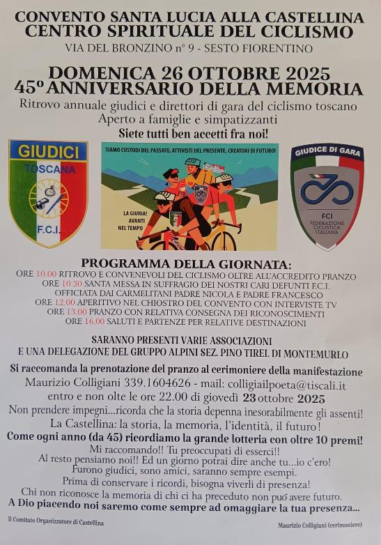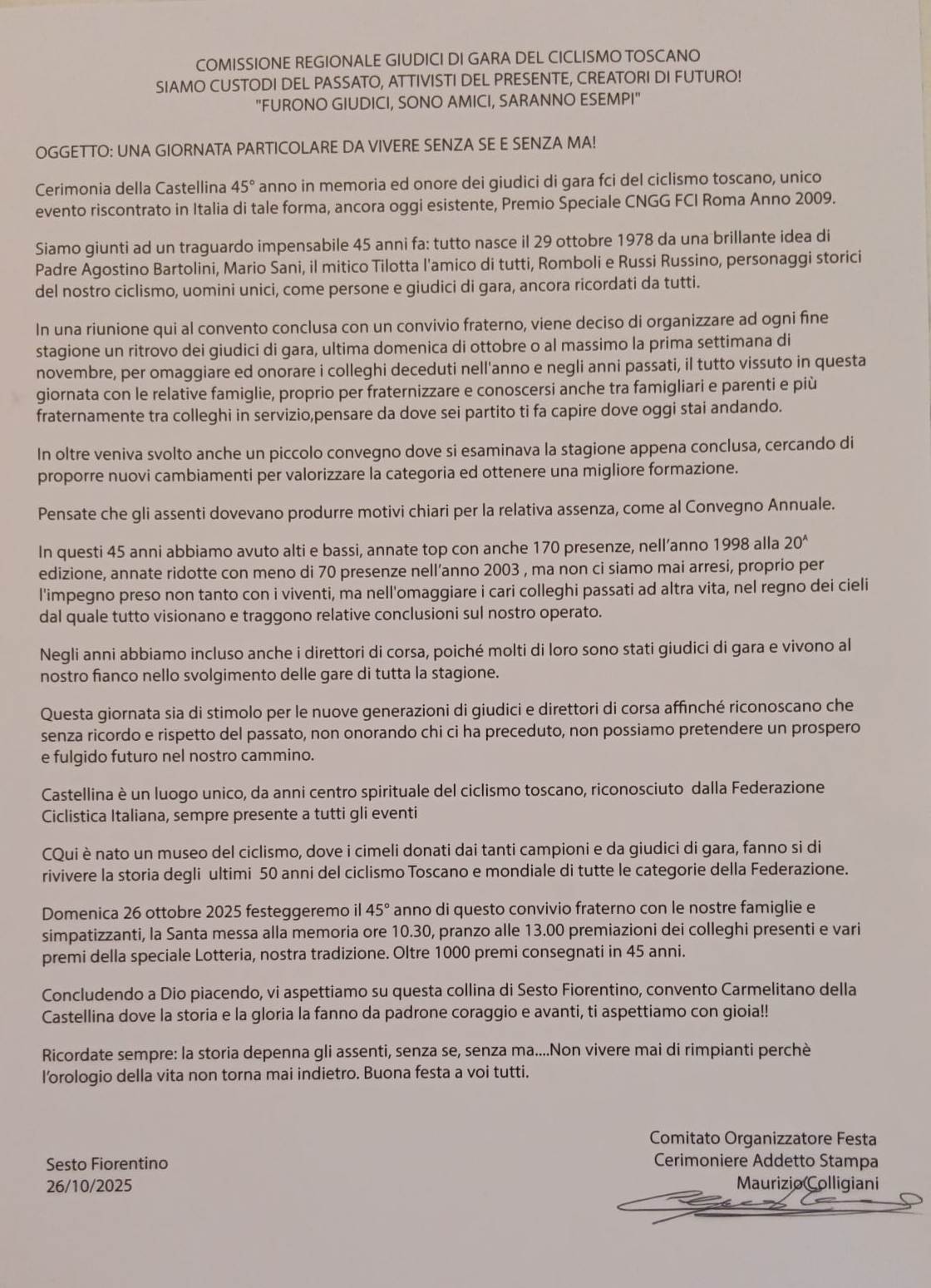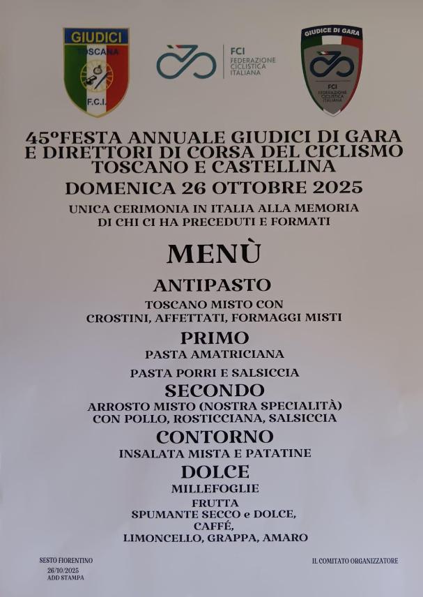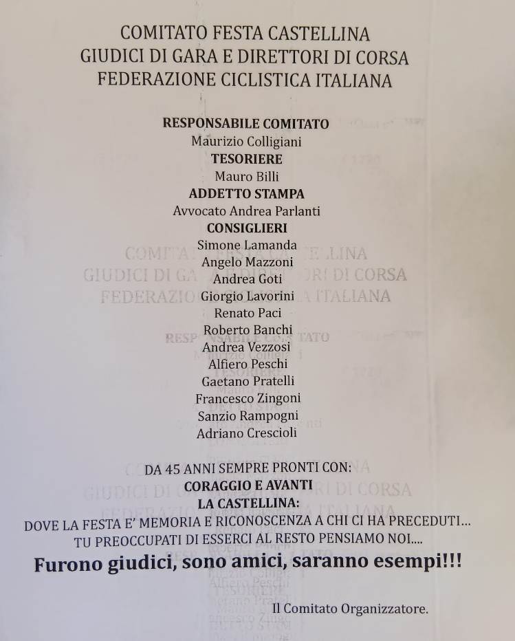 .Compito che viene evidenziato magistralmente dallo stesso Animatore del Comitato Festa dei Giudici di Gara e Direttori di Corsa della Federciclismo e che è descritto nelle locandine più che esaustive del Programma che pubblichiamo su questa stessa pagina ringraziando Maurizio Colligiani per il suo impegno che, da una vita, spende per il Movimento Ciclistico Italiano.