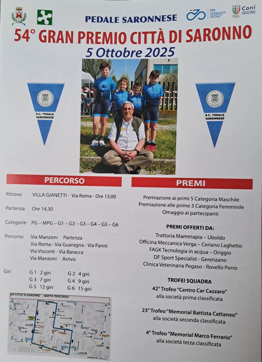 Con l’instancabile impegno del Direttore Sportivo del Pedale Saronnese, Mario Aleotti col supporto di tutto il Consiglio Direttivo del Pedale Saronnese, i Volontari, l’Amministrazione Comunale e varie Associazioni cittadine, domenica 5 ottobre a Saronno torna il “Grande” ciclismo interpretato dai “Piccoli” del Pedale.