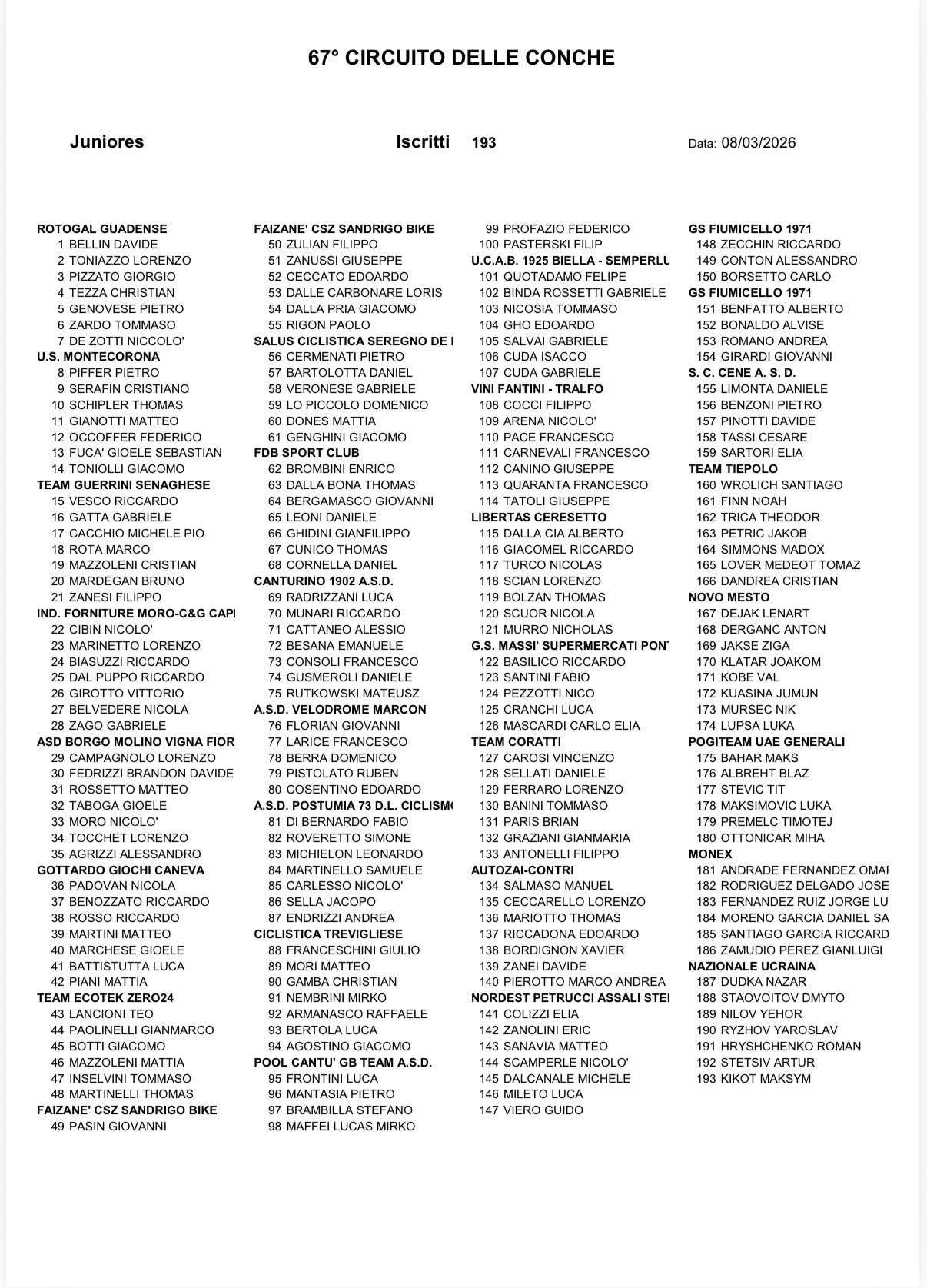 Ordine d’arrivo del 67° Circuito delle Conche :