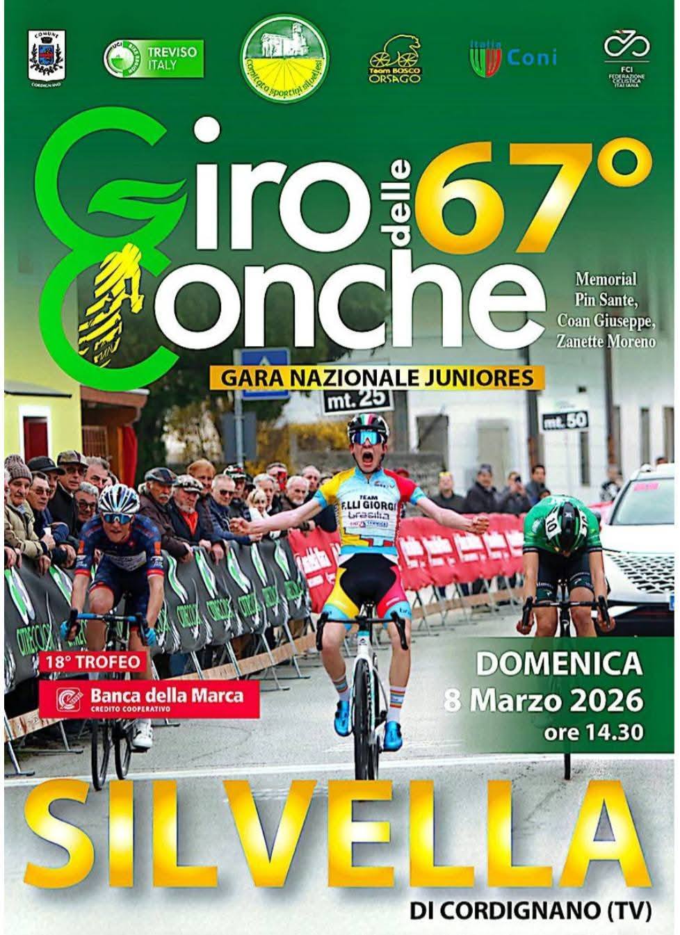 Con 191 corridori al via e ben 4 squadre straniere ai nastri di partenza è scattato da Silvella di Cordigliano il classico Circuito delle Conche gara giunta alla 67° edizione con l’organizzazione dal Team Bosco di Orsago (Bravi anche nel ciclocross) con supporto del “Comitato degli Sportivi Silvellesi”.