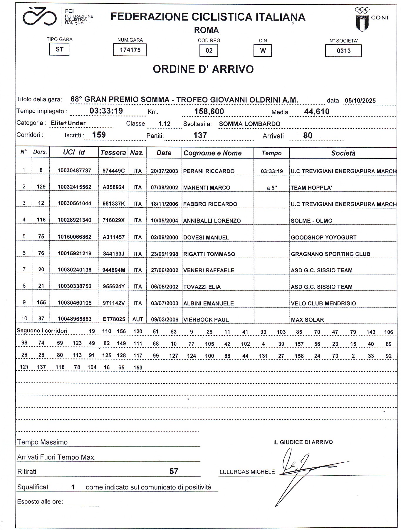 1)Riccardo Perani (UC Trevigiani Energiapura-Marchiol) km 158,6 in 3h33’19” media kmh 44,610;