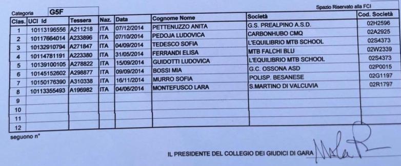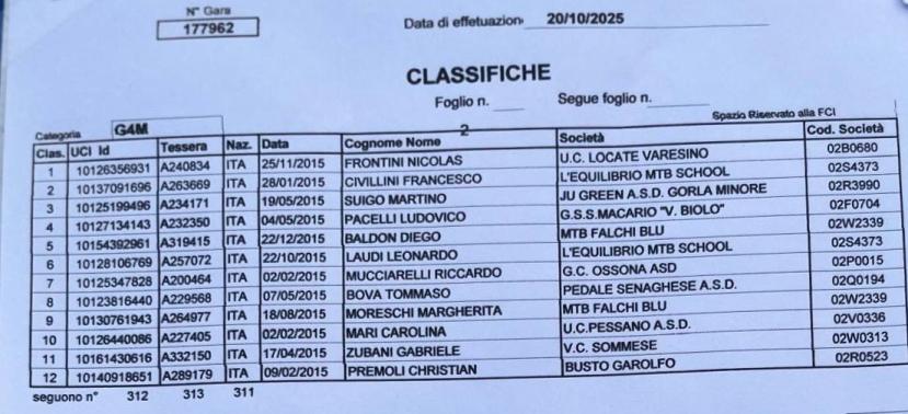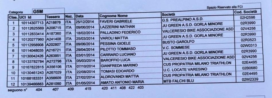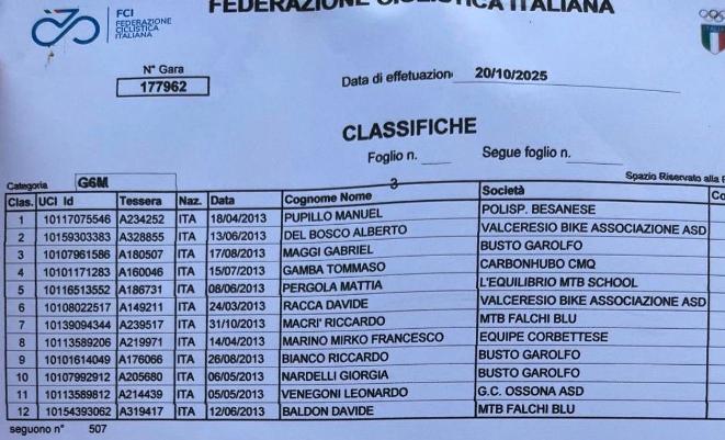 1)Lorenzo Civita (JU Green – Gorla Minore); 2)Pietro Benanchetti (X – Team); 3)Andrea Macri (MTB Falchi Blu); 4)Gabriele Crespi (U.C. Locate Varesino); 5)Cesare Zonca (U.S. Osio Sotto); 6)Enea Piazza (U.S. Dairaghese Ciclismo); 7)Raffaele Civillini (L’Equilibrio – MTB School); 8)Enea Bonollo (Ju Green – Gorla Minore); 9)Gioele Caimi (G.C. Ossona); 10)Gioele Todeschini (Triangolo Lariano).