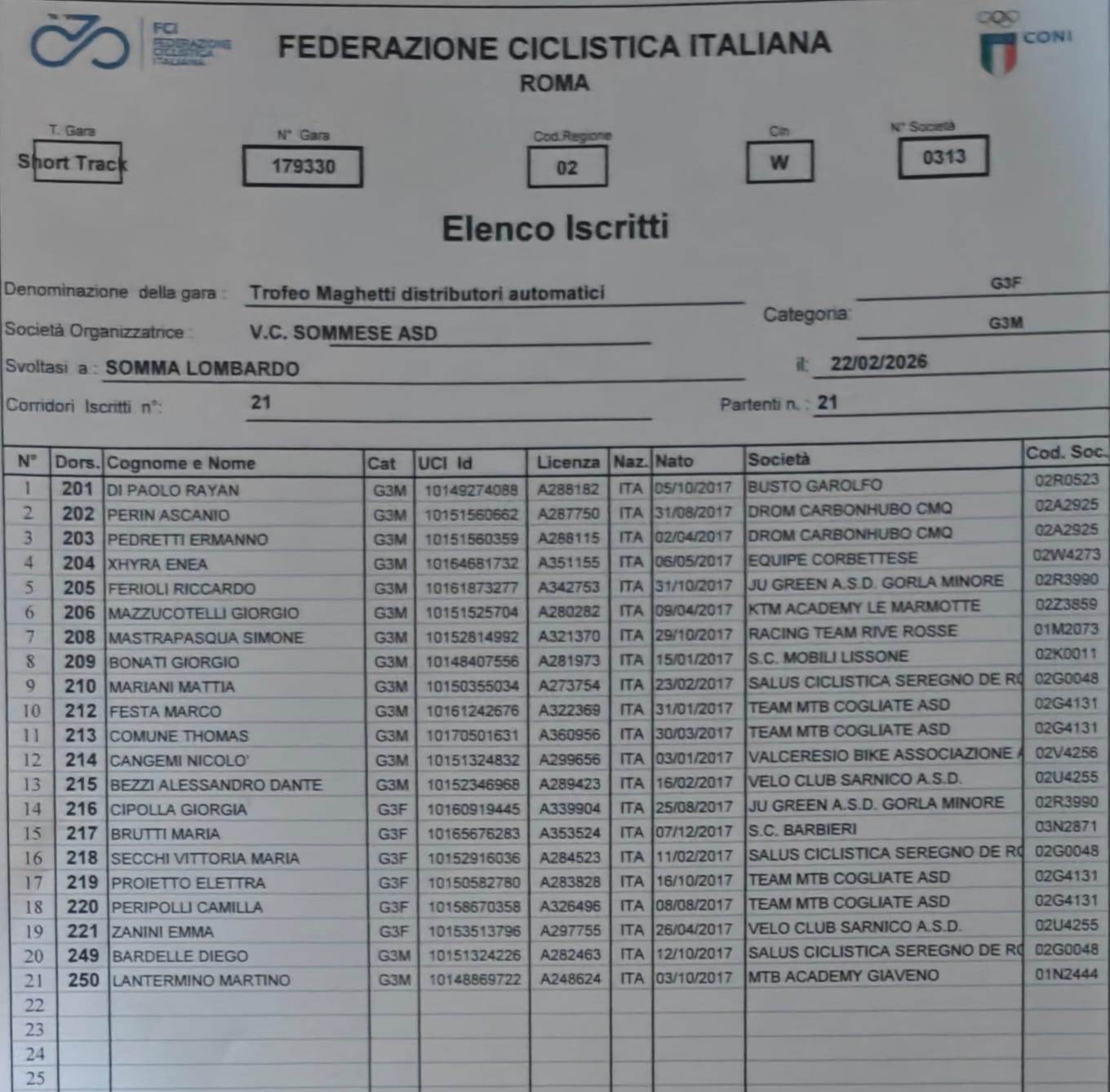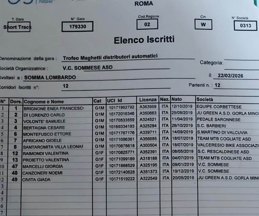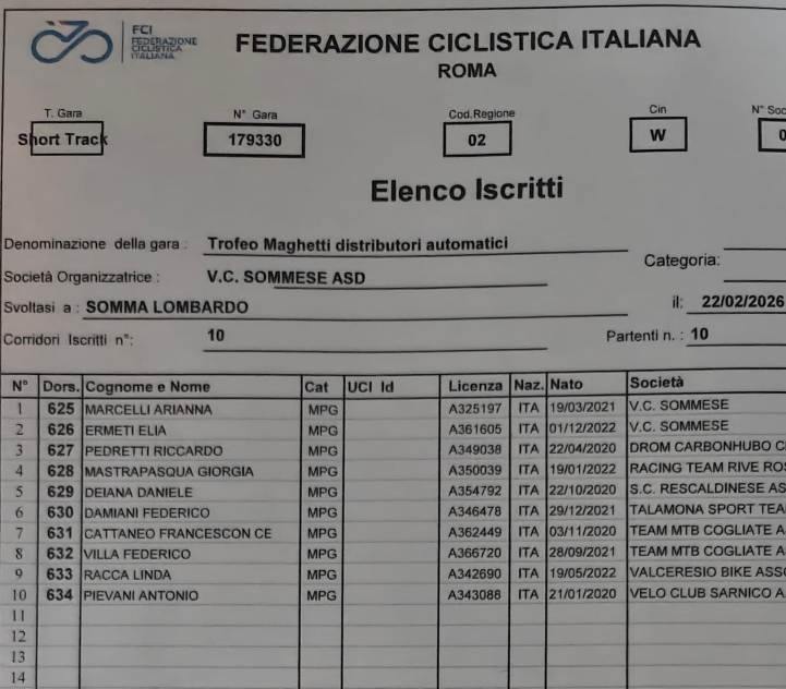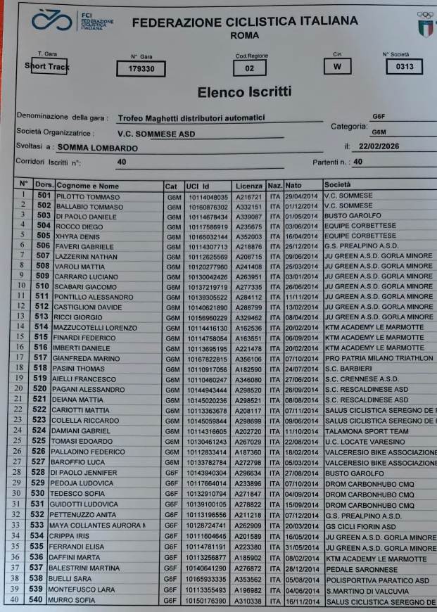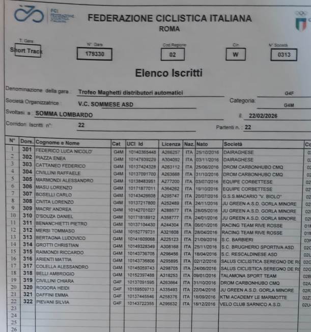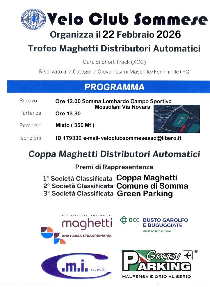 Domani, domenica 22 Febbraio 2026, con l’organizzazione del Velo Club Sommese del Presidente Cav. Silvio Pezzotta, si alza ufficialmente il sipario sulla stagione agonistica 2026 della categoria “Giovanissimi” di entrambi i sessi, con la disputa del Trofeo Maghetti Distributori Automatici gara specialità Short Track (Ciclocross categorie giovanissimi) aperto ai corridori m/f delle categorie dai G1 ai G6 oltre alla categoria MPG (Corridori non tesserabili per motivi anagrafici).