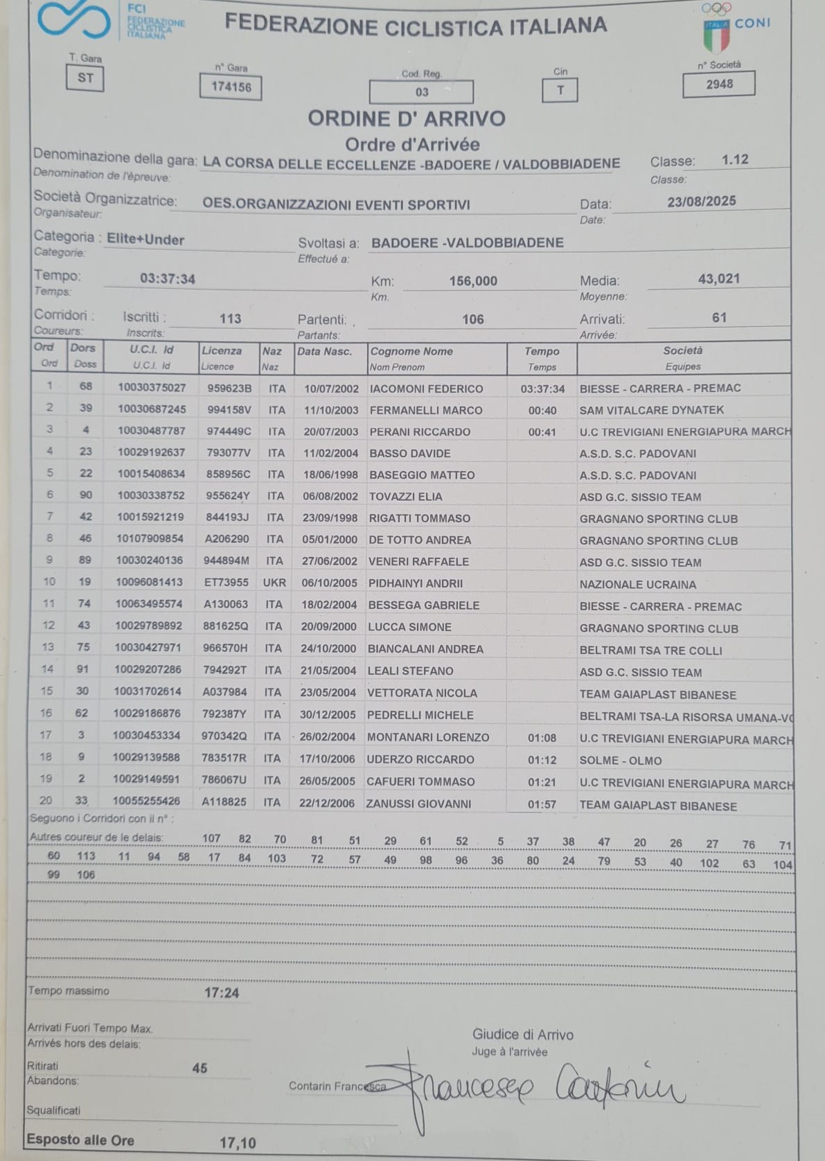 Iacomoni riconosce la preziosa collaborazione di Gabriele Bessega che lo ha lanciato a poco meno di due chilometri dall’ultimo GPM poi, sono parole di Iacomoni, mi sono piegato sul manubrio e ci ho dato dentro in solitaria per una ventina di chilometri esultando poi per la stupenda vittoria con sua sorella e, suo papà che lo attendevano al traguardo.
