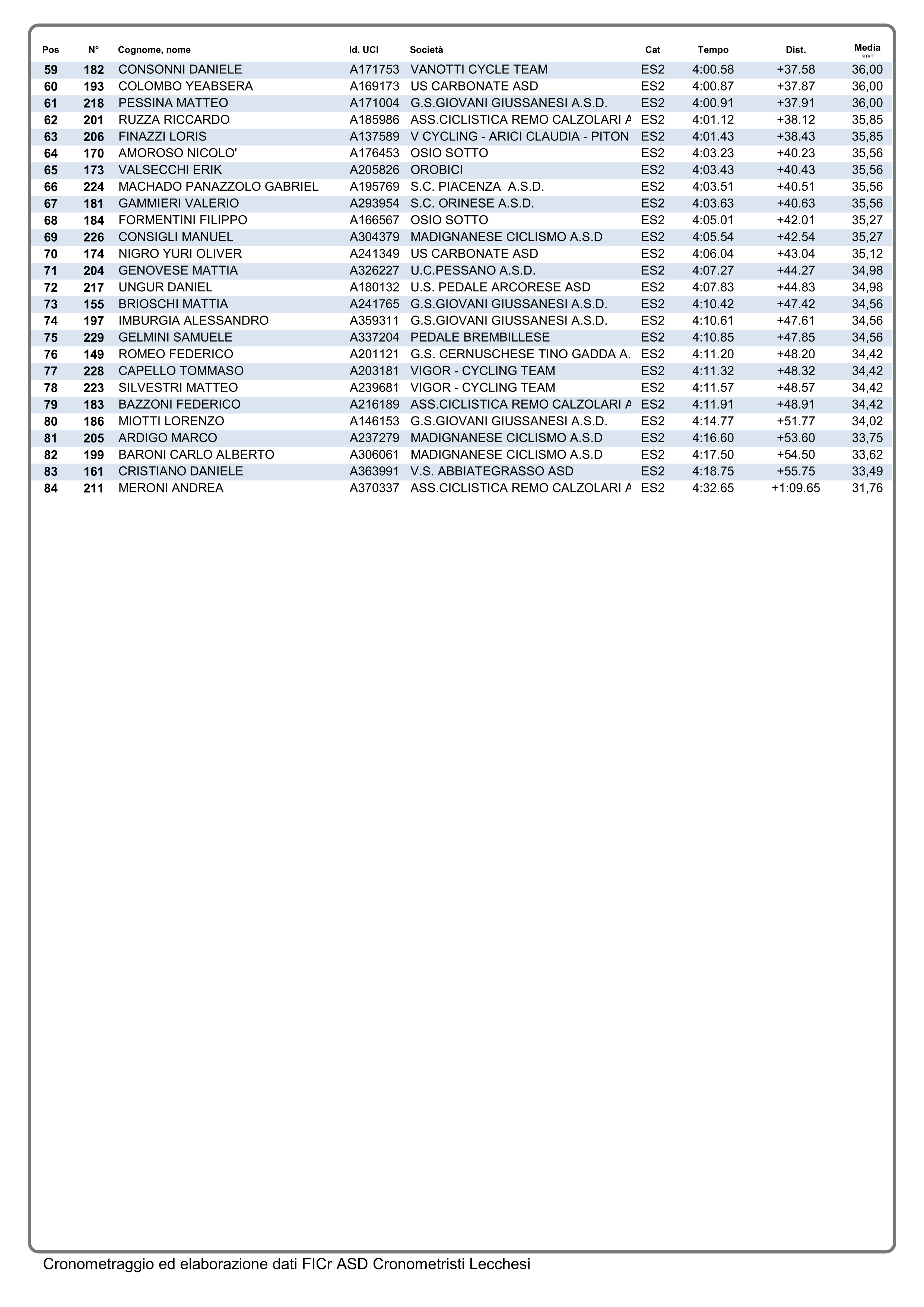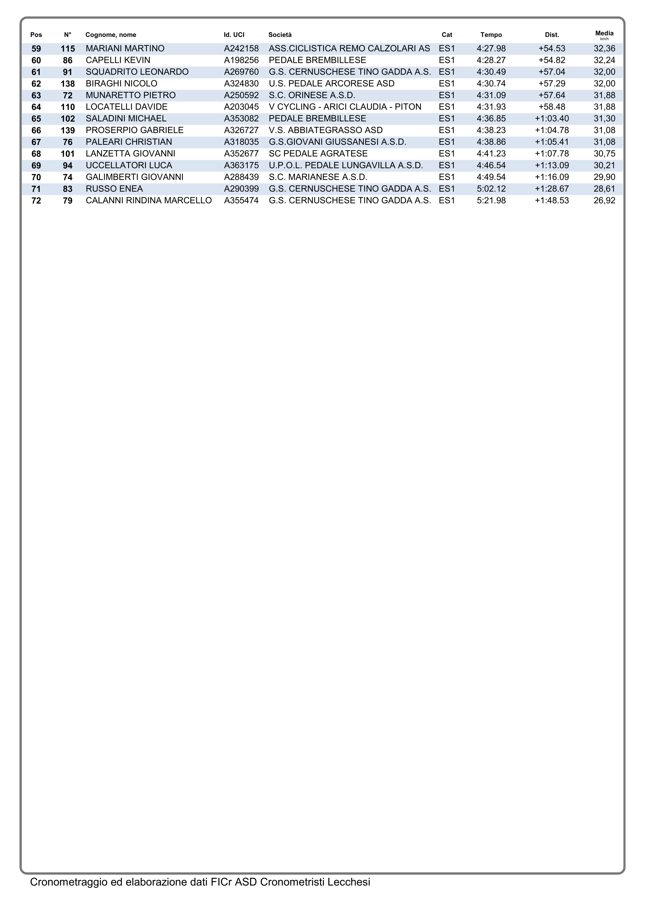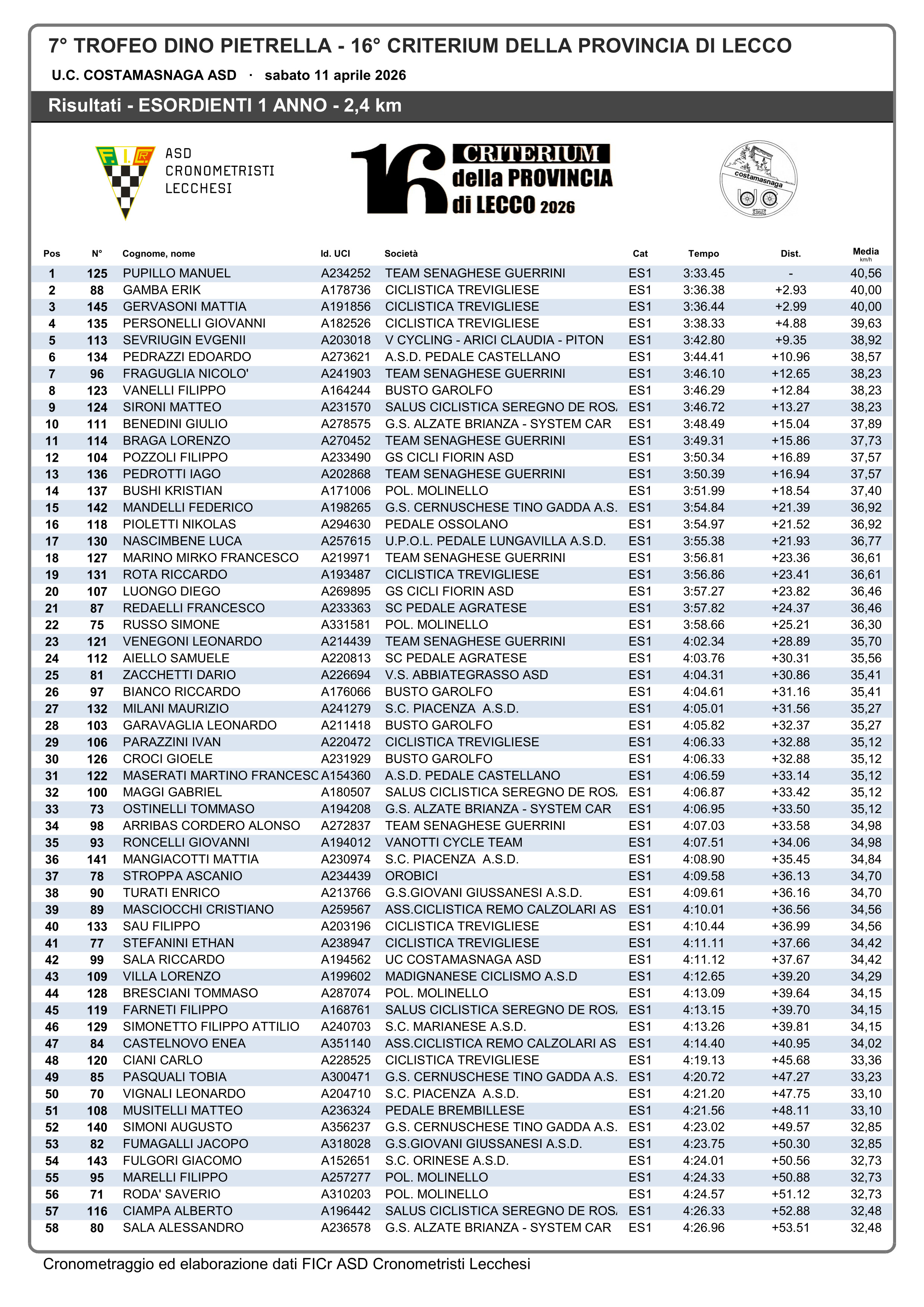 Tra i primo anno trionfa Manuel Pupillo (Team Senaghese-Guerrini) con 2″93% sul bergamasco Erik Gamba (Ciclistica Trevigliese) e 2″99% su Mattia Gervasoni anche lui della Ciclistica Trevigliese a completare il podio di giornata.