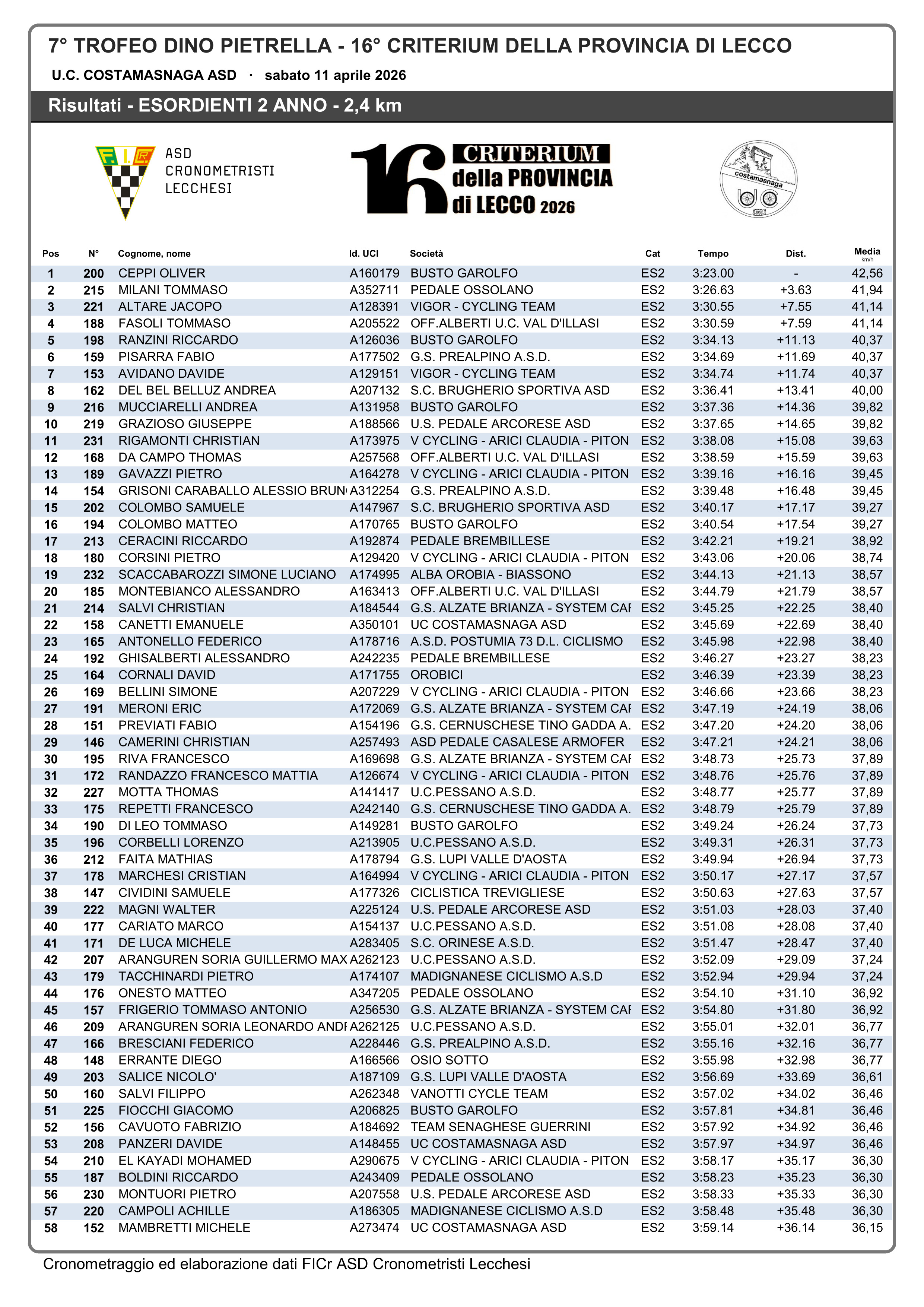 Tra i secondo anno, (hanno gareggiato su di un percorso di km 2,4), netto successo per l’alfiere della SC Busto Garolfo 1954 Oliver Ceppi che ha pedalato sui km 2.4 del percorso in 3’23” precedendo il piemontese Tommaso Milani (Pedale Ossolano), di 3″ 63% alla media di kmh. 42,560; al terzo posto un altro piemontese, Jacopo Altare (Vigor Cycling Team) che ha completato il podio a 7″55% dal vincitore.