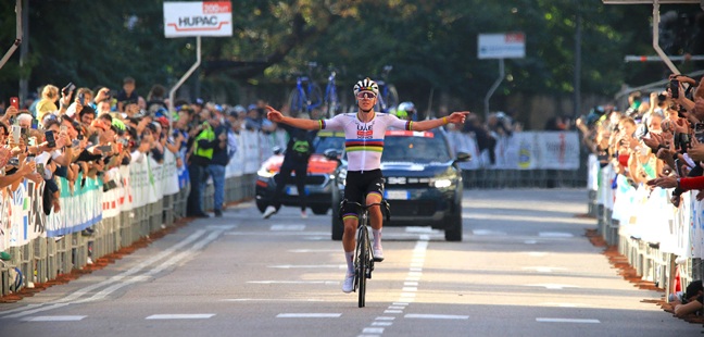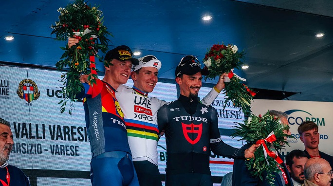 Si cambiando gli addendi perchè una volta scatta a 100 chilometri dall’arrivo; un’altra volta scatta magari più vicino alla linea del traguardo ma, come ha fatto oggi a Varese il copione è variato con decisione infatti, quando mancavano “solamente” 21 chilometri all’arrivo è scattato e lo ha fatto….”in discesa” e via in solitudine verso la via Sacco sede di arrivo della 104° tre Valli Varesine con….soli 46″ di vantaggio sugli immediati inseguitori regolati da Philipsen (Lidl-Trek) per il posto d’onore e l’ex iridato Julian Alaphilippe (Tudor-Pro Cycling Team) per il terzo gradino sul podio.