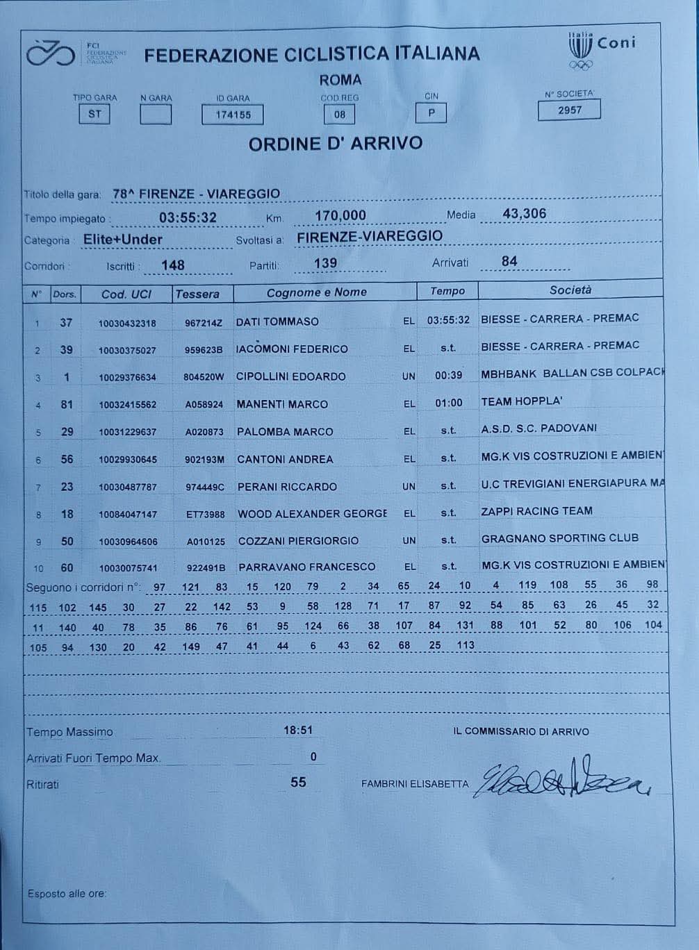 Ordine Arrivo della 78° Firenze-Viareggio Elite-Under 23:
