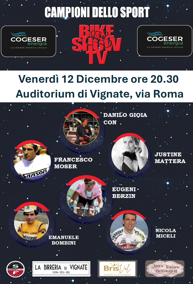 Bike Show Tv e Campioni dello Sport, una serata in teatro a Vignate (Mi) con grandi Campioni del ciclismo e ospiti speciali.