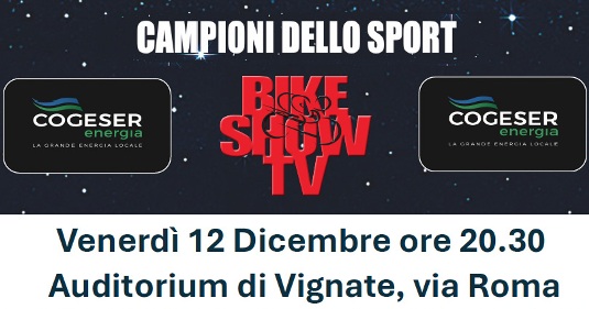 Bike Show Tv e Campioni dello Sport, una serata in teatro a Vignate (Mi) con grandi Campioni del ciclismo e ospiti speciali.