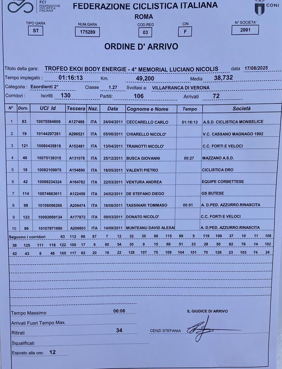E tanto entusiasmo non è andato al vento perchè il Velo Club Cassano Magnago 1992 ha conseguito un brillante risultato con Nicolò Chiarello battuto allo sprint dal vice Campione d’Italia Carlo Ceccarello (Ciclistica Monselice) che vanta già 12 vittorie.