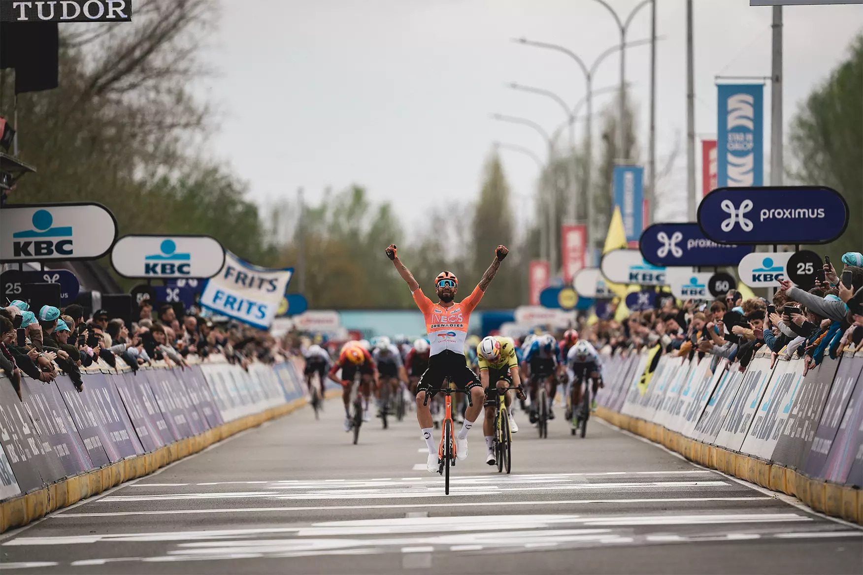 Una vittoria di prestigio conquistata innanzi tutto contro la sfortuna pensate, una foratura, un cambio di bicicletta e un manubrio rotto e, come se ciò non bastasse anche un Campione come Wout Van Aert in fuga e che Filippo Ganna è andato a prendere da solo per poi batterlo in fase di volata.